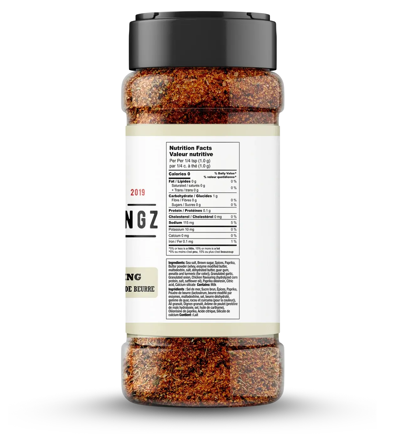 Sea Salt, Brown Sugar, Spices, Paprika, Butter Powder (Whey, Enzymes, Modified Butter, Maltodextrin, Salt, Dehydrated Butter, Guar Gum, Annatto and Turmeric for Colour), Granulated Garlic, Granulated Onion, Chicken Flavouring (Hydrolyzed Corn Protein, Salt, Safflower Oil), Paprika Oleoresin, Citric Acid, Calcium Silicate.