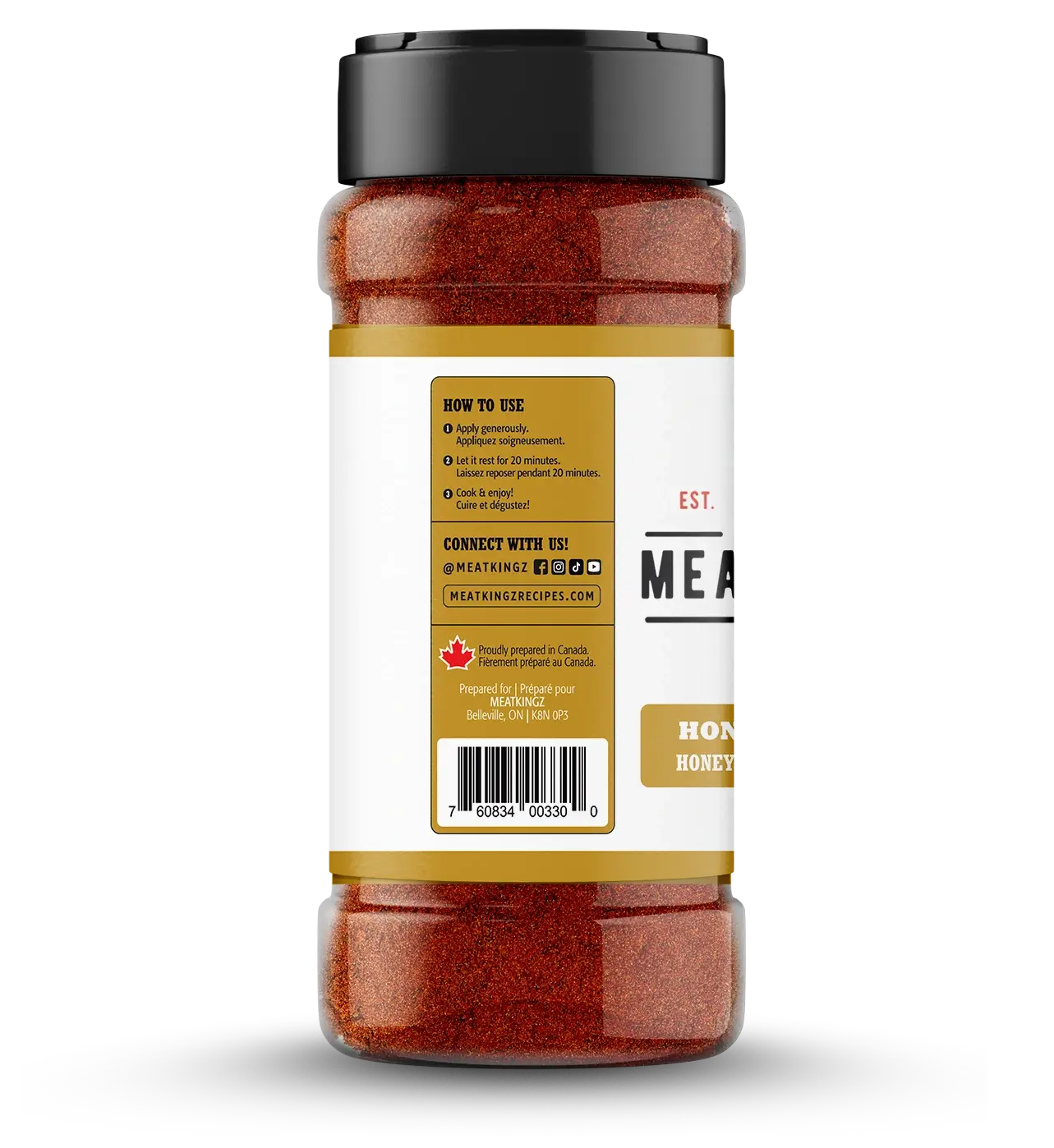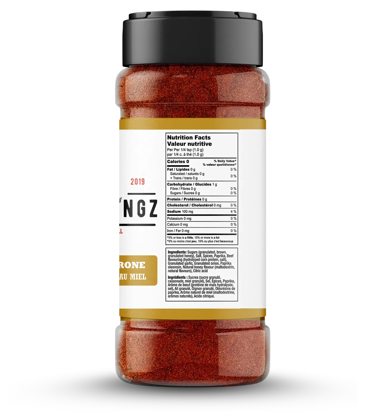 Ingredients: Sugars (Granulated, Brown, Granulated Honey), Salt, Spices, Paprika, Beef Flavouring (Hydrolyzed corn protein, salt),ย Granulated Garlic, Granulated Onion, Paprika Oleoresin, Natural Honey Flavour (Maltodextrin, Natural Flavours), Citric Acid